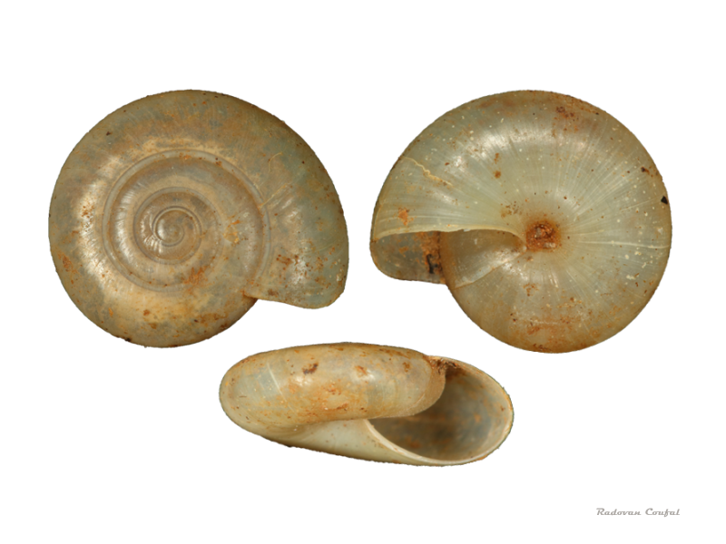 Popis: Placatá okrouhlá ulita s mírně vypuklým kotoučem s nápadným leskem a šedavě žlutavou barvou s mléčným zákalem na spodní straně dorůstá výšky 5,5 mm a šířky 12 mm. Ústí je mírně šikmé a obústí ostré. Píštěl je široce otevřený.