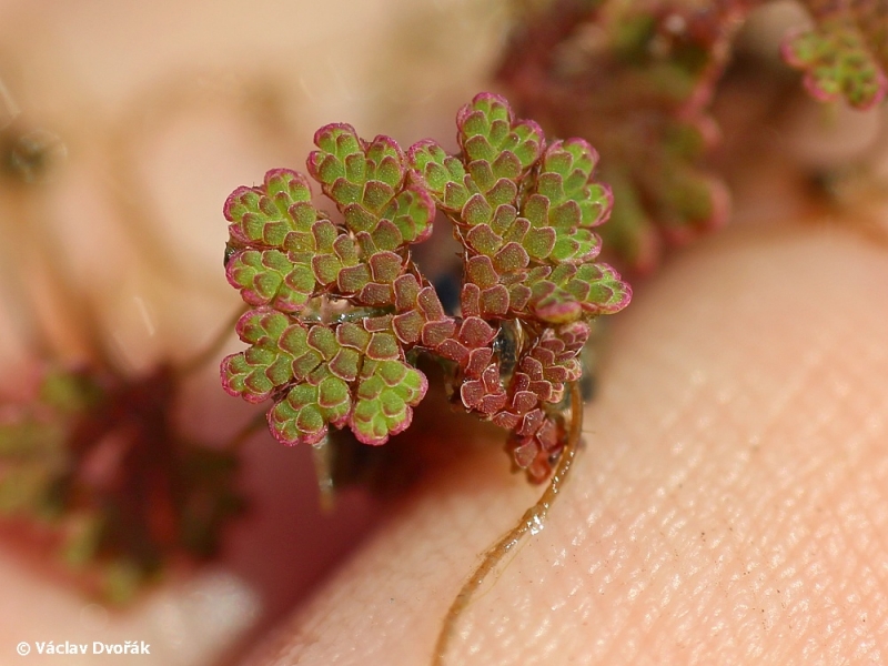 Popis: Heterosporická, na hladině vzplývající nebo na vlhkém bahně rostoucí kapradina. Lodyhy vidličnatě větvené, do 2 cm dlouhé; listy dvouřadé, střídavé, překrývající se, k vrcholu zmenšující se, kratičce chlupaté, zelené, ale na přímém slunci a ke konci vegetační sezóny červenající. Sporokarpy jednopohlavní, dimorfní; výtrusy bradavčité.