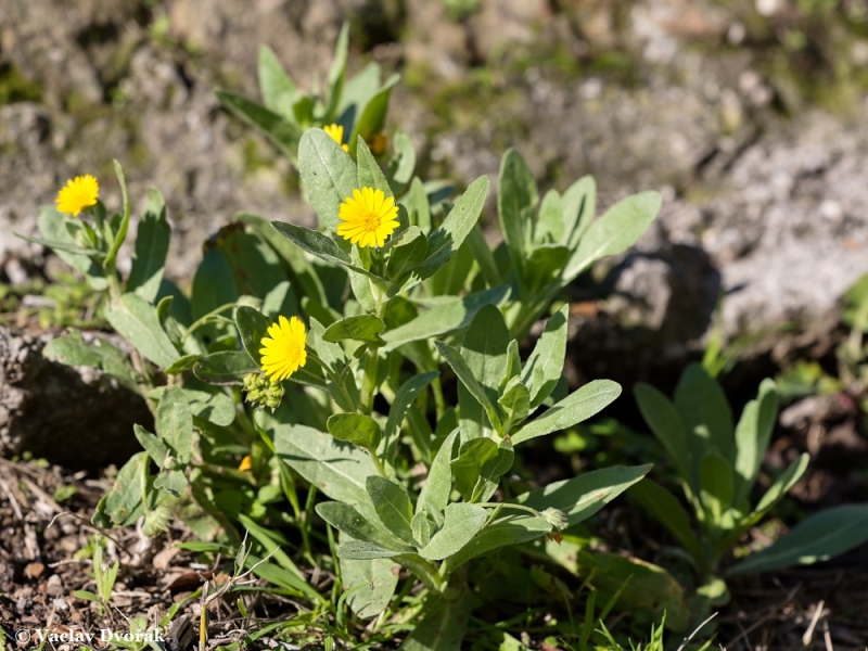 Popis: Bylina s vícero lodyhami, obloukovitě vystoupavými, bohatě větvenými, do 30 cm vysokými. Spodní listy kopisťovité, za plodu zaschlé; ostatní tvarem podlouhlé, nezvlněné, po obou stranách krátce chlupaté. Úbory jednotlivé, do 2 cm v průměru, za plodu nicí; jazykovité květy světle žluté, dozrávající v nažky. Vnější nažky vždy vyvinuté, dovnitř zahnuté, nekřídlaté, světle hnědé.