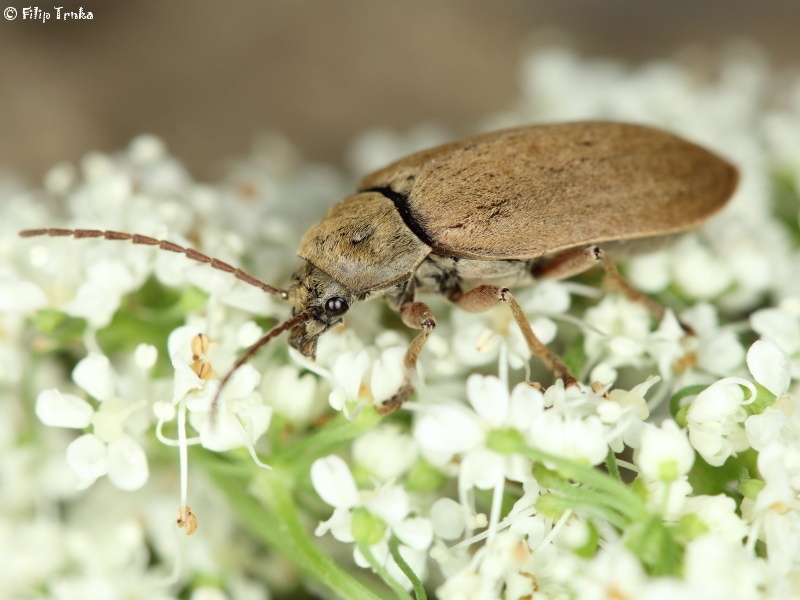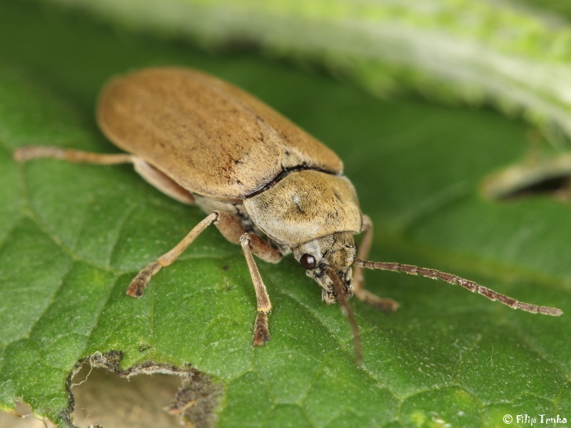 Popis: Délka těla 9–11,5 mm. Zbarvení těla tmavé s přilehlými, hustými šedými nebo žluto-hnědými chloupky. Tykadla dlouhá, nitkovitá. Štít není širší než krovky. Celé tělo protáhlé a oválné.