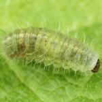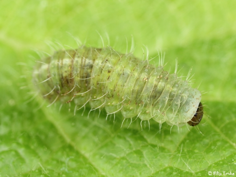 Popis: Délka těla 7,5–9,5 mm. Tělo černé se světlými hnědavými chloupky, tmavé chloupky tvoří pravidelné kruhovité skvrnky. Tykadla a končetiny také se světlými hnědavými chloupky. Samičky mají výrazně široké oválné krovky, na rozdíl od samců, kteří jsou štíhlejší. Larvy jsou zelenavé s dlouhými světlými chlupy.