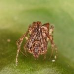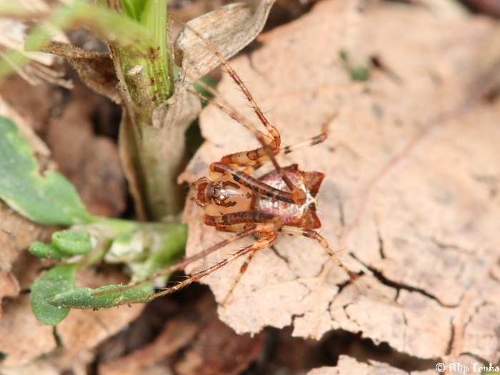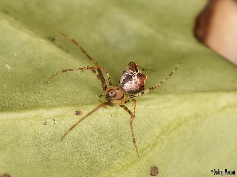 Popis: Délka těla 3,5–4,5 mm (hlavohruď 1,5–2 mm). Hlavohruď je světle hnědá s tmavou linkou na okraji a tmavými skvrnami okolo očí. Zadeček je kulovitý se čtyřmi výraznými ostrými hrboly, které jsou nápadné zejména u samců. Zbarvení zadečku je rezavohnědé, mezi hrbolky bělavý s tmavými skvrnami. Nohy jsou světle hnědé s tmavými skvrnami.