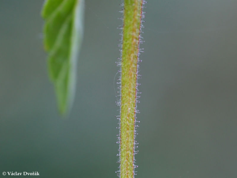 Popis: Bylina s tenkým kořenovým systémem. Lodyhy přímé, větvené, v dolní části červeně naběhlé, hustě porostlé přitisklými i stopkatě žláznatými chlupy s červeným sekretem. Listy krátce řapíkaté, kopinaté, na okraji s 5–8 páry drobnými zuby. Květy po 2–20 v oddálených lichopřeslenech; listeny pod květem se stopkatými žlázkami; kalich chlupatý; koruna 2krát delší než kalich, světle fialová, se žlutou skvrnou uprostřed středního laloku, s rovnou, bílou korunní trubkou. Plodem jsou hladké, světle hnědé tvrdky.