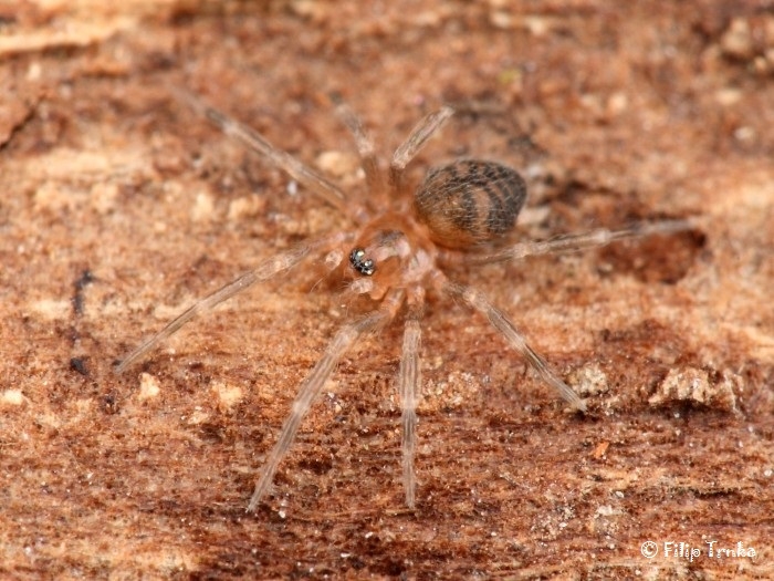 Popis: Drobný pavouk o délce těla 2–3 mm (hlh. 0,8 mm). Hlavohruď je žlutohnědá až světle červenohnědá s tmavou skvrnou ve středu a několika drobnými tečkami po okraji. Zadeček je oválný tmavě hnědý až černý s třemi páry světlých teček, které v zadní části přecházejí v proužky. Nohy jsou žlutohnědé nevýrazně proužkované.