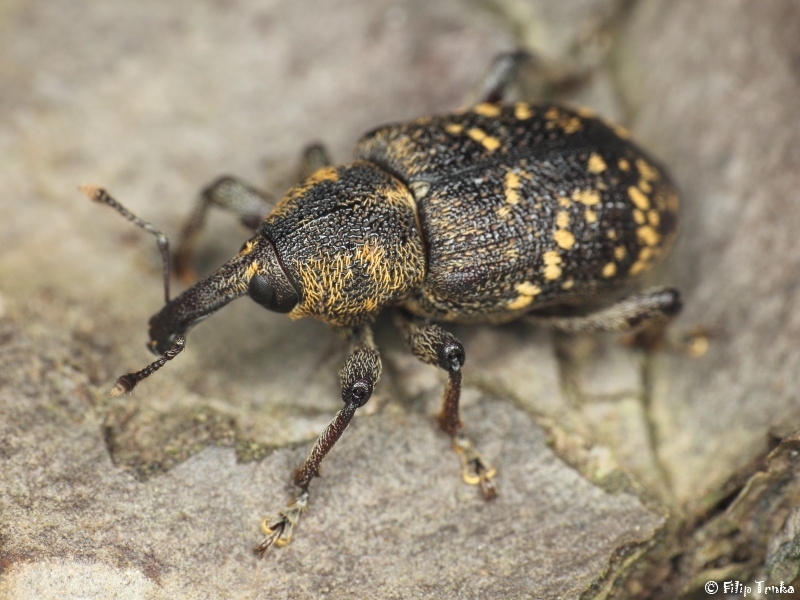 Popis: Délka těla 7,3–13,5 mm, zbarvení těla černo-hnědé se žlutými šupinkami, které tvoří přerušované příčné pásky. Oči výrazně protáhlé, nosec silný na vrcholu rozšířený, slabě zakřivený. Štít delší než širší, štítek s drobnými chloupky a krovky širší než štít. Stehna se zoubky.