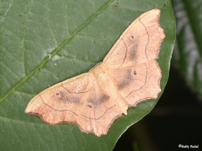 Popis: Rozpětí křídel 22–25 mm, délka těla okolo 12 mm. Tykadla jsou u obou pohlaví nitkovitá. Tělo je žlutohnědé. Přední křídla jsou žlutohnědá s dvěma tenkými linkami a tmavou tečkou. Zadní křídla jsou žlutohnědá s jednou linkou a tmavou tečkou. Obě křídla jsou na okraji vykrojená. Housenka je světle hnědá s nevýraznou světlejší kresbou.