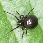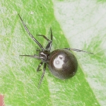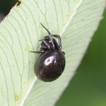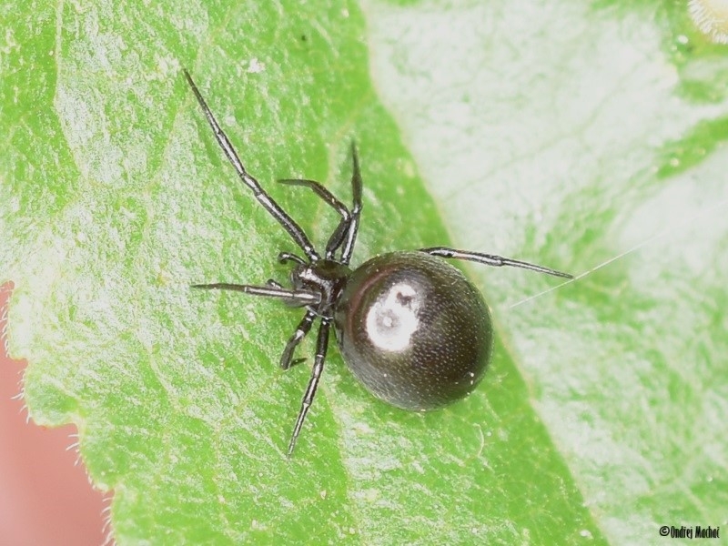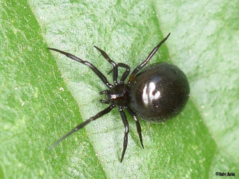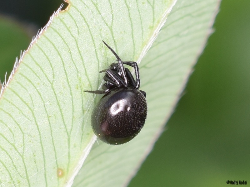 Popis: Délka těla 2,5–4 mm (hlavohruď 1,2–1,5 mm). Hlavohruď je černá až hnědočerná, lesklá, bez kresby, u samců v přední části mírně vyvýšená a protažená dopředu. Zadeček je kulovitý, leskle černý až hnědočerný. Nohy a makadla jsou černé, na kloubech a bázi stehna se žlutooranžovým kroužkem. Samci jsou menší než samice a mají drobnější zadeček.