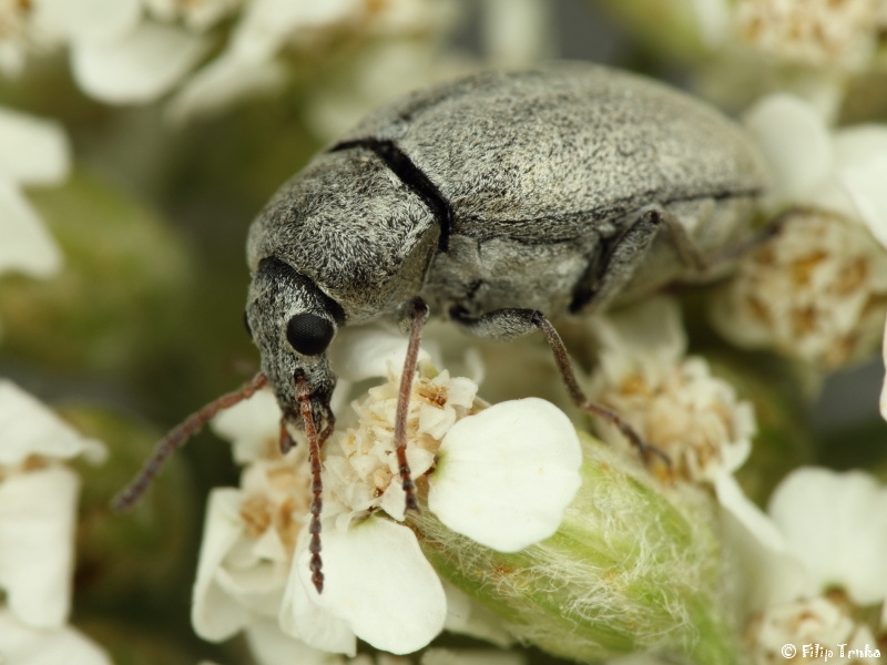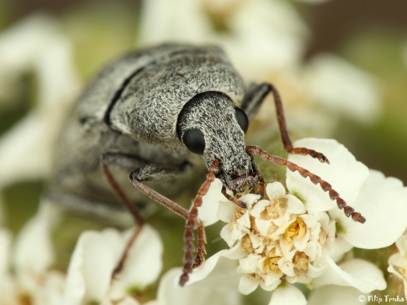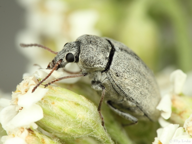 Popis: Délka těla 5–9 mm, zbarvení těla černé, holeně, chodidla a tykadla světlejší než stehna (nejčastěji načervenalá). Celé tělo pokryto šedo-bílými chloupky (starší jedinci mohou být odření a pouze černí). Choupkování krovek je mírně odstávající. Nosec je krátký.