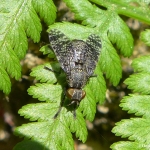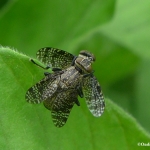 Popis: Délka těla 5–8 mm, rozpětí křídel cca 12 mm. Hlava je černá až šedohnědá, poměrně malá. Oči jsou hnědočervené. Tykadla jsou krátká nitkovitá. Hrudní štít je svrchu lysí, šedohnědě skvrnitý. Zadeček je šedočerný se světlejšími skvrnami. Nohy jsou jednobarevně černé. Křídla poměrně široká, tmavě šedá se světlými tečkami vytvářející druhově specifickou kresbu.