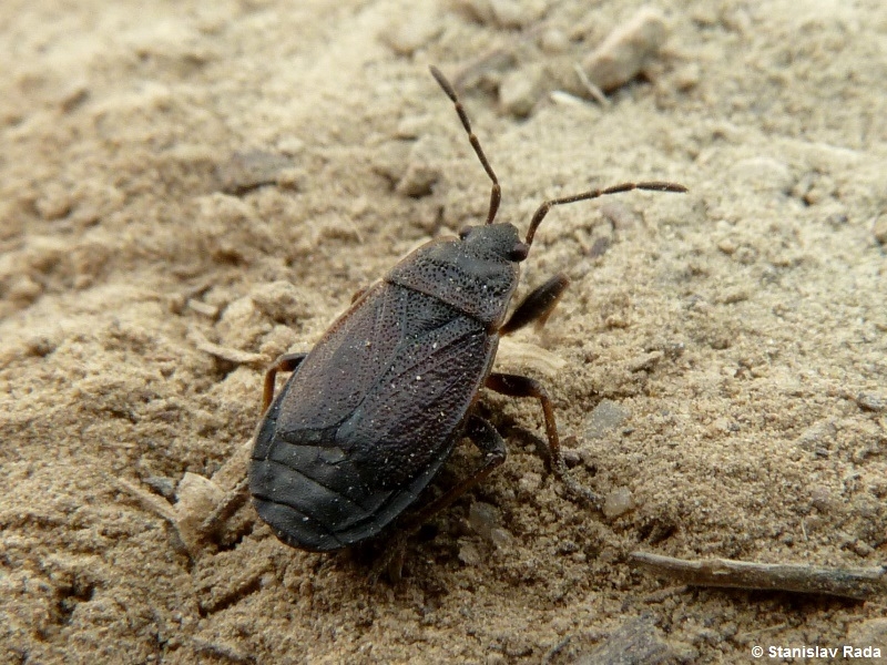 Popis: Ploštice s oválním tělem délky 7–8 mm. Zbarvení těla je černé, vnější okraje štítu a polokrovek jsou nevýrazně hnědě lemovány, hnědé jsou také holeně a chodidla. Polokrovky pokrývají přibližně dvě třetiny zadečku, řídce se však vyskytuje i makropterní forma s plně vyvinutými křídly, u které polokrovky pokrývají celý zadeček.