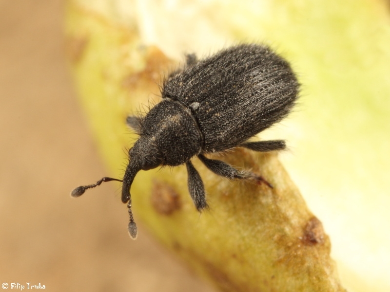 Popis: Velikost těla 3-3,7 mm. Nosec stejnoměrně mírně zakřivený. Tykadlové články tmavě hnědé. Štítek světlý. Nohy černé, tarzální články červenohnědé. Celý povrch těla je pokryt dlouhými odstávajícími černými, šedými a bílými zahnutými chlupy.