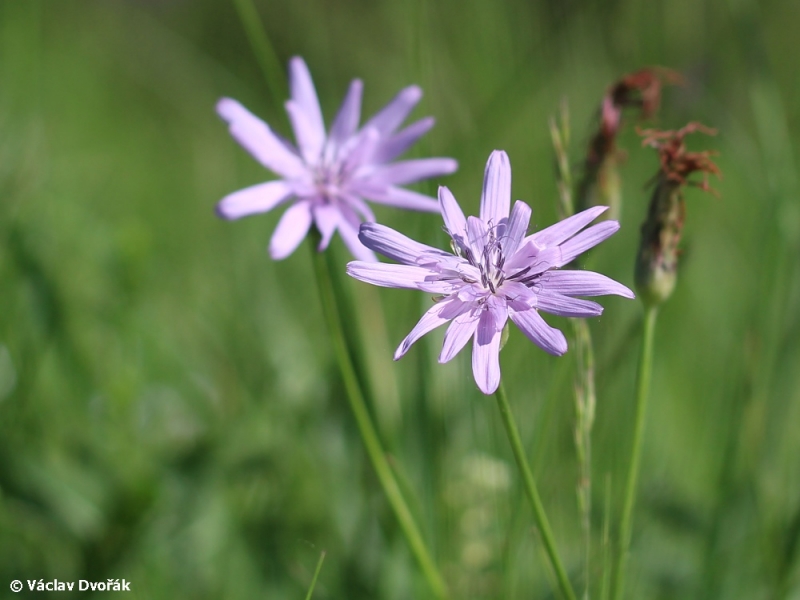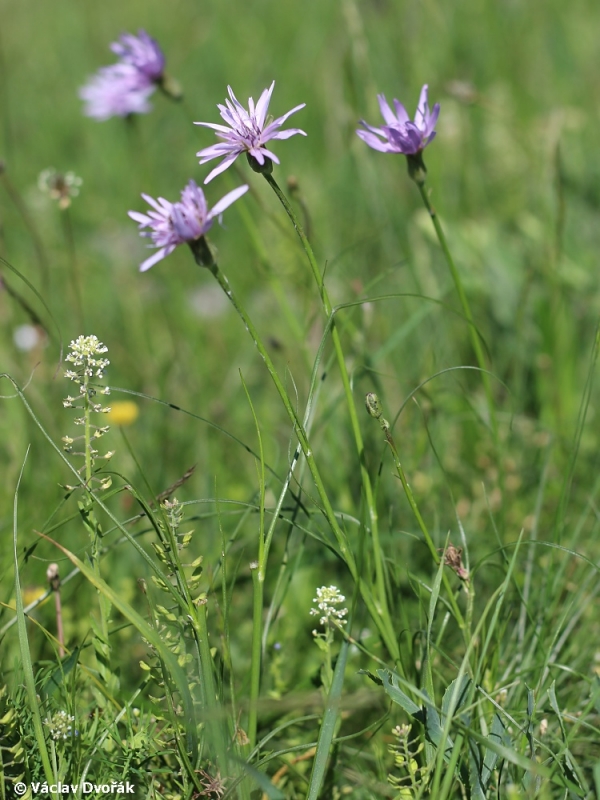 Popis: Sivozelená bylina s jedinou, přímou, lysou, pouze pod úbory někdy pavučinatě vlnatou, olistěnou, v horní polovině větvenou, do 60 cm vysokou lodyhou. Přízemní listy přisedlé, čárkovité, žlábkovité, na hřbetě kýlnaté, celokrajné (graminoidního vzezření); lodyžní listy objímavé. Úbory obvykle v počtu 2–4, rozkvétající v dopoledních hodinách; zákrov vejcovitý. Liguly jazykovitých květů až 2krát delší než zákrov, světle růžové až světle fialové, slabě vonící po vanilce. Nažky válcovité, žebernaté, světle hnědé; chmýr zdéli nažky, špinavě bílý.