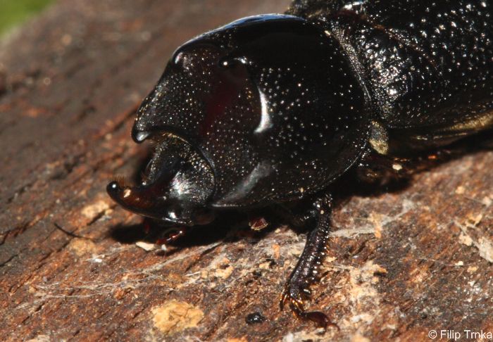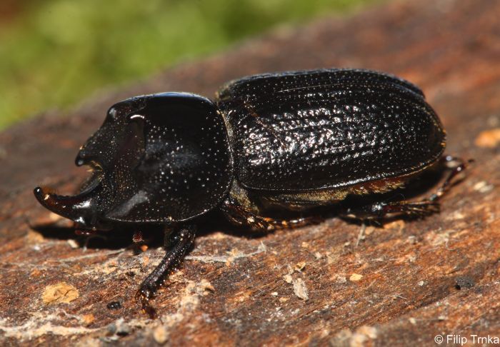 Popis: Délka těla 12-16 mm, černý, lesklý a válcovitý. Samci mají nápadný roh, který je jemně ochlupený. U samců je štít do značné míry prohlouben, je hladný s drobnými mělkými tečkami. Samičky roh postrádají, mají pouze drobný hrbolek a štít je silně hluboce tečkován. Krovky jsou silně hrubě tečkovány a mají lištovité hrbolky.