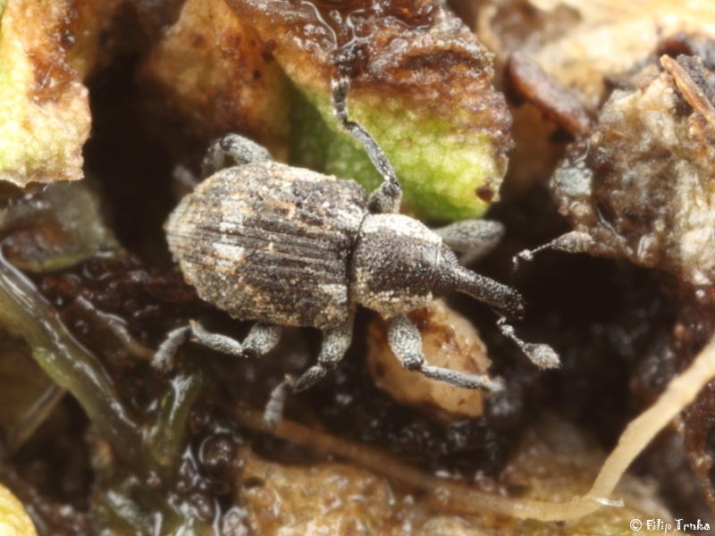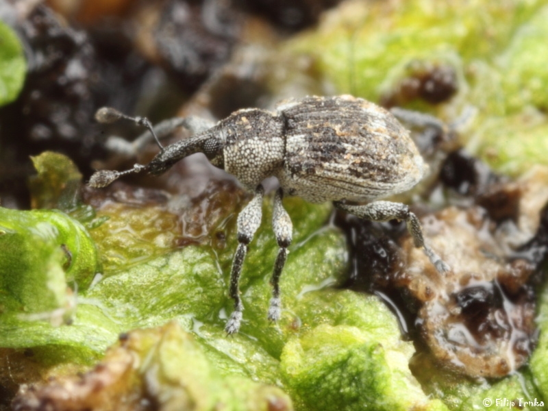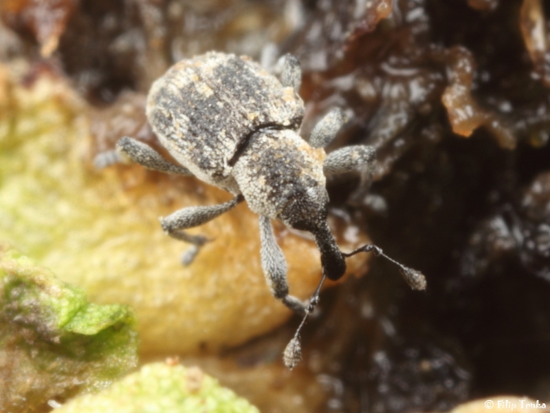 Popis: Velmi drobný nosatec o velikosti těla 1,4–1,6 mm, Zbarvení těla černé, na štítu a krovkách se světlými šupinkami, které tvoří skvrny. Nohy a tykadla černé, tykadlový bičík a palička někdy tmavohnědé.