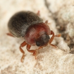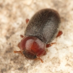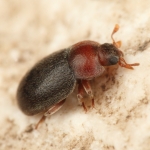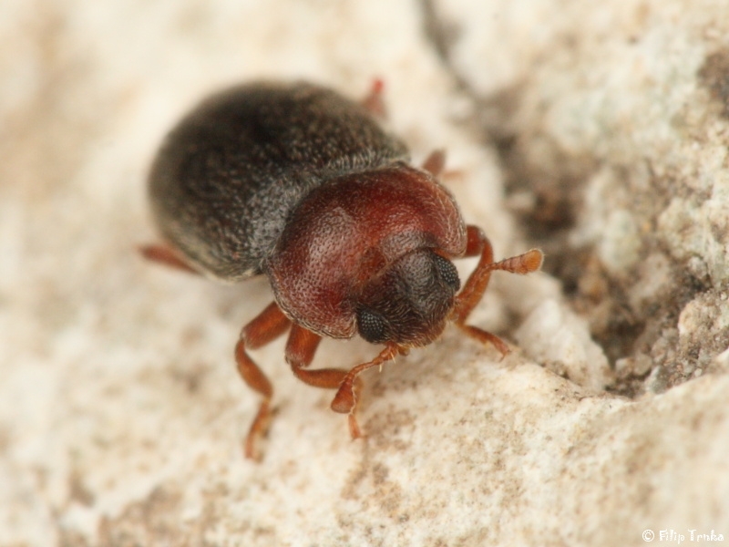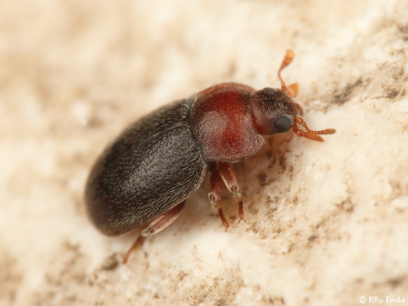 Popis: Velikost těla 2,5–3,5 mm. Tělo dvakrát širší než delší, protáhlé, ploché a krátce ochlupené. Zbarvení hlavy a štítu rezavo-hnědé, krovky černo-hnědé. Přívěsky rezavo-hnědé. Tykadla dlouhá desetičlenná a paličkovitá, chodidla čtyřčlenná. Krovky jsou srostlé, nelétavý druh.