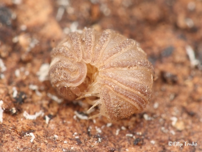 Popis: Drobná mnohonožka o délce těla 2,5–5,5 mm, šířka těla je 1,2–1,9 mm. Tělo je krátké s výraznými hrbolatými žebry. Zbarvení je žlutohnědé až žlutobílé. Na bocích hlavového článku je nápadný kruhovitý vtisk. Je schopná volvace (svinutí).