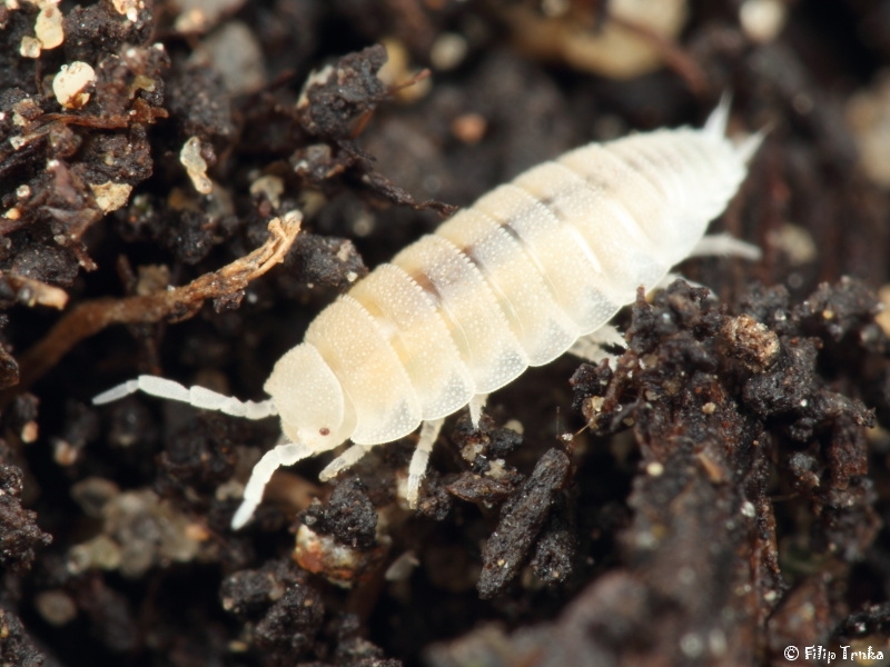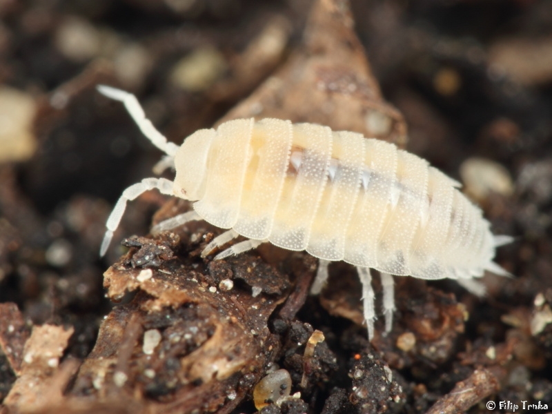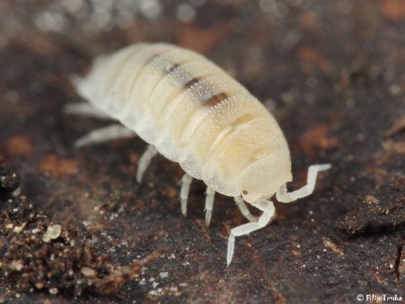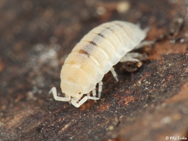 Popis: Délka těla 3–4 mm. Tělo je oválné, bělavé až žlutavé. Hlava s dvěma krátkými trojúhelníkovitými laloky. Tykadla lomená s poměrně dlouhými články. Oči jsou tmavé a malé. Povrch tělních článků matný a jemně zrnitý. Tergity zakončeny řadou krátkých, ale nápadných zoubků. Uropody poměrně dlouhé.