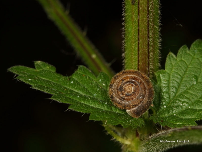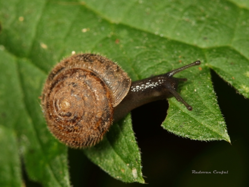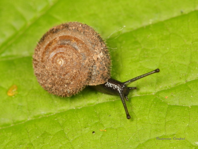 Popis: Tenkostěnná jemně rýhovaná ulita nejčastěji rohově hnědé až narudlé barvy stlačeně kruhovitého až vypouklého tvaru dorůstá šířky 8,5 mm a šířky až 5 mm. Ulita bývá často pokrytá krátkými (okolo 0,3 mm) ohnutými chloupky, které však bývají často opadané. Po opadaných chloupcích zůstávají na povrchu patrné jizvy. Na obvodu posledního závitu je patrná zaoblená hrana. Ústí je eliptické, obústí poměrně ostré a ztlustlina lemující ústí poměrně hluboko položená, vystouplá ve spodní (palatální) části. Píštěl je poměrně široký, nicméně jeho šířka je proměnlivá.