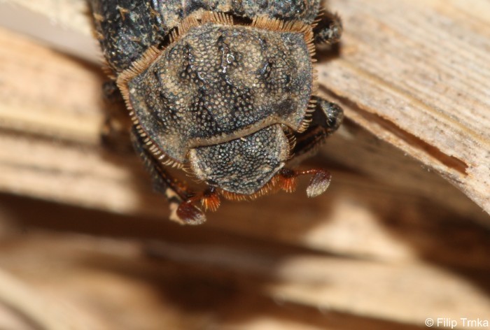 Popis: Velikost 9-11 mm, tělo oválné a vzadu rozšířené. Zbarvení je hnědé až hnědo-černé. Hlava je hustě tečkovaná, obrvená a vrásčitá stejně jako štít, který je také dlouze obrven chloupky. Hlava je malá a zatažitelná. Tykadla jsou 10článková a zakončeny vejířkem, zbarveny jsou do rezava. Krovky s výraznými rýhami a hrbolky, z hrbolků vystupují štětinky, okraj krovek také obrvený. Spodek těla témeř lysý.